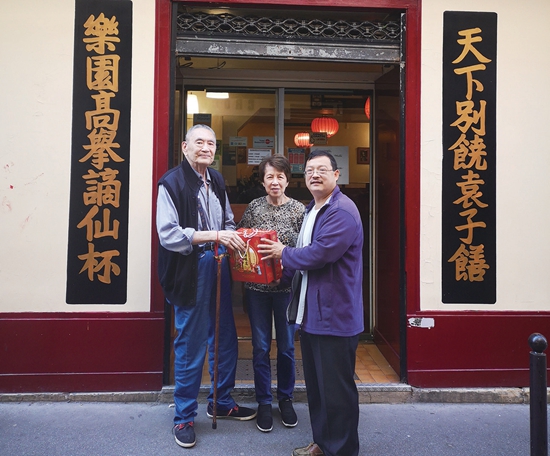 【欧洲时报记者欧文巴黎报道】法国当地时间9月18日,旅法山东同乡陆续来到位于巴黎13区的“老山东”餐馆,从法国山东同乡会会长赵云鹏和法国山东商会会长王博生手中接过了一盒中秋月饼和一份家书,拉开了由山东省侨办、山东省侨联主办,山东华侨会馆(山东华侨博物馆)、法国山东同乡会、法国山东商会承办的“月圆中秋·家乡味道”慰侨活动在法国的序幕。赵云鹏向每一个前来领取月饼的旅法山东同乡介绍说,一盒月饼,送来的是家乡的牵挂,是亲人的祝福。在这个团圆时刻,家乡侨务部门没有忘记迢迢山水之外、远离故土的旅法和其他海外乡亲。王博生表示,“小小月饼,殷殷思念;迢迢家书,拳拳祝福”。