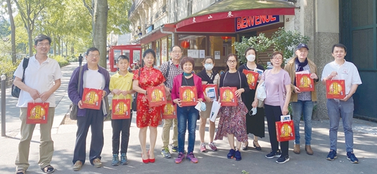 法国山东同乡会会长赵云鹏(左一)和法国山东商会会长王博生(右一)为乡亲们发放月饼。(图片来源:欧洲时报记者欧文 摄)