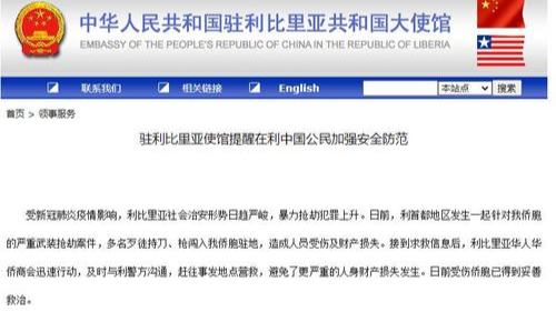 据中国驻利比里亚大使馆网站消息,受新冠肺炎疫情影响,利比里亚社会治安形势日趋严峻,暴力抢劫犯罪上升。日前,利首都地区发生一起针对中国侨胞的严重武装抢劫案件,多名歹徒持刀、枪闯入侨胞驻地,造成人员受伤及财产损失。接到求救信息后,利比里亚华人华侨商会迅速行动,及时与利警方沟通,赶往事发地点营救,避免了更严重的人身财产损失发生。日前受伤侨胞已得到妥善救治。