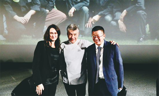 吴忠(右)与米其林三星名厨雷吉斯·马孔(中)、索菲·罗布雄总裁在活动现场。