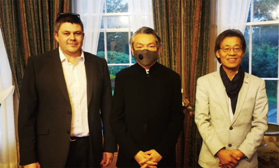 郑曦原总领事会见英国对华事务委员会首席执行官石傲立(Ollie Shiell)和大曼彻斯特女王副官、曼彻斯特中国花园创建委员会秘书长杨钜文。(图片来源:主办方供欧洲时报)