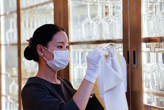 2021年11月11日,工作人员在擦拭红酒杯。