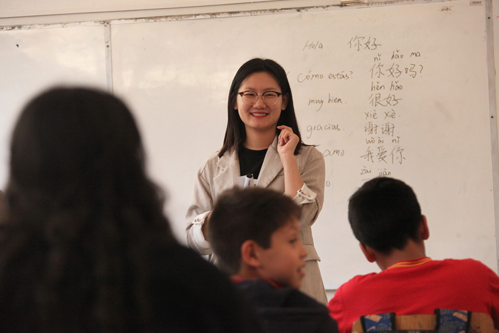 在智利首都圣地亚哥的长江学校,中文老师李媛媛给孩子们教授生活常用语。(图片来源:中新社)