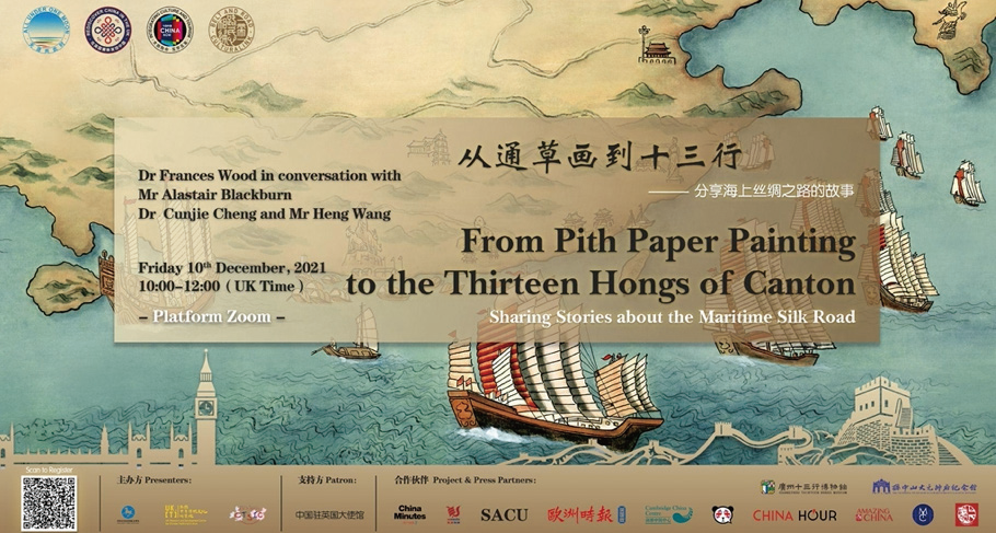 【欧洲时报实习记者章蔚文报道】12月10日,“从通草画到十三行——分享海上丝绸之路的故事”主题讲座于伦敦时间上午10点在Zoom平台上顺利举办。此次讲座由英中了解协会副会长、著名汉学家吴芳思(Frances Wood)博士主持,邀请到了英国通草画藏家布朗(Alastair Blackburn),中国通草画研究专家、孙中山大元帅纪念馆馆长程存洁以及广州十三行博物馆荣誉馆长王恒作为嘉宾,一同探讨了由“通草画”这一种文物作为载体的中西方文化贸易交流的历史与发现。此次讲座还提供了中英双语同声传译,方便了来自中英不同地区的听众。