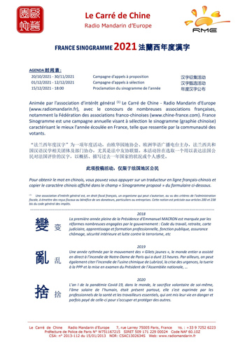 2021年“法兰西年度汉字”征稿启示。(图片来源:twitter@France:le sinogramme de l‘année)