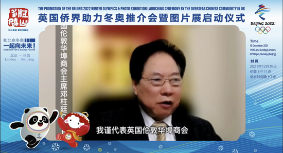 【欧洲时报实习记者李忆南报道】12月19日,主题为《和北京冬奥一起向未来》的英国侨界助力冬奥会推介会暨图片展启动仪式于线上举办。该活动由英国金丝结联盟、英国山东同乡会、英国河北同乡会、英中摄影协会、英国考切斯特中国文化协会、英中体育交流协会、北京大盟文化艺术有限公司、北京欧林时代文化传播中心联合主办,在中国驻英国大使馆、中国外文局中东欧与中南亚传播中心(人民画报社)、北京市侨联、中国国际教育电视台、中国艺术研究院篆刻院及河北省侨联联合指导下,并由英中经济文化促进会、中英武术协会、欧洲时报社等40多家社团和机构协办。当天在线启动仪式在中国国际教育电视台TVR融媒体中心和《欧洲时报》英国版的新浪微博账号“英伦圈”上直播,累计有7.38万人观看,收获15.16万的点赞。