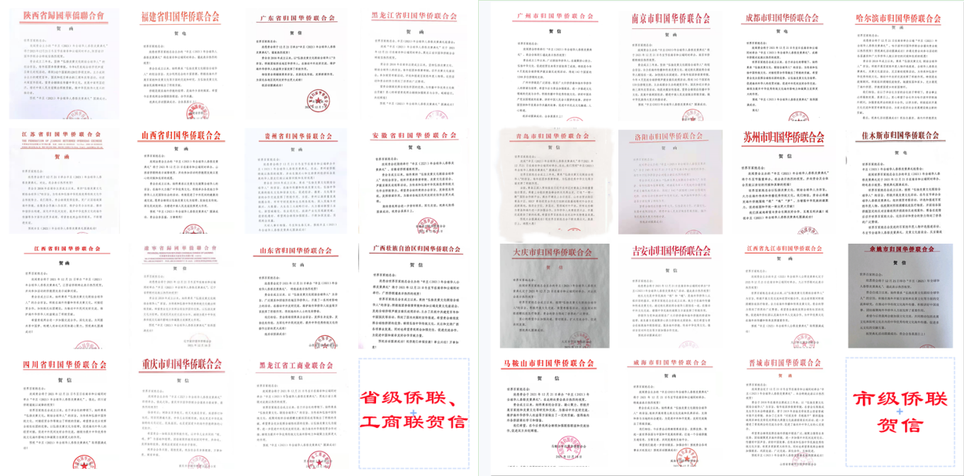向主办方和组委会发来贺信的有:陕西省侨联、福建省侨联、广东省侨联、江苏省侨联、黑龙江省侨联、江西省侨联、广西侨联、贵州省侨联、四川省侨联、重庆市侨联、安徽省侨联、山东省侨联、山西省侨联、辽宁省侨联、湖南省侨联,河南省洛阳、哈尔滨、广州、青岛、南京、苏州、成都、佳木斯、大庆、吉安、九江、威海、马鞍山、晋城、浙江余姚、缙云等市县侨联,黑龙江省工商联等相关团体,非洲华侨周报、莫桑比克华人报、赤道几内亚华人报、西非华声报、安哥拉华人报等50多家华媒,挪威中文学校、西班牙华侨华人中文学校、吉尔吉斯斯坦明月教育中心等30多所华校,欧洲中华总商会、亚洲地区中国和平统一促进会总会、中南美洲中国和平统一促进会、大洋洲·中国“一带一路”经济贸易促进会、赞比亚江西同乡会和南部非洲九江同乡总会(总商会)等五大洲120多个国家的300多个侨团,总共近500个组织。