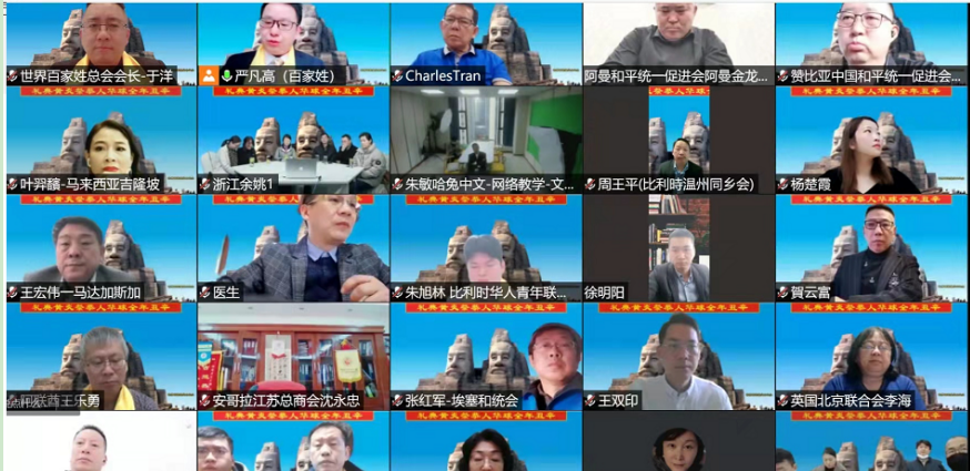 张素久、南庚戌、蔡文显、王福生、陈贻成、曹明权等五大洲近百位侨领以视频连线方式出席典礼,世界百家姓总会于洋、南非华人基金会主席吴少康、全非洲黑龙江总商会会长安馨、罗马尼亚华商联合总会执行会长许健等侨领分别代表五大洲、港澳台、侨界反歧视人物、侨界抗疫人物和各省华商代表团敬献花篮。各国侨界以视频会议、分会场、参祭视频录制、炎黄文化座谈会和网络研讨会等多种方式参与典礼。