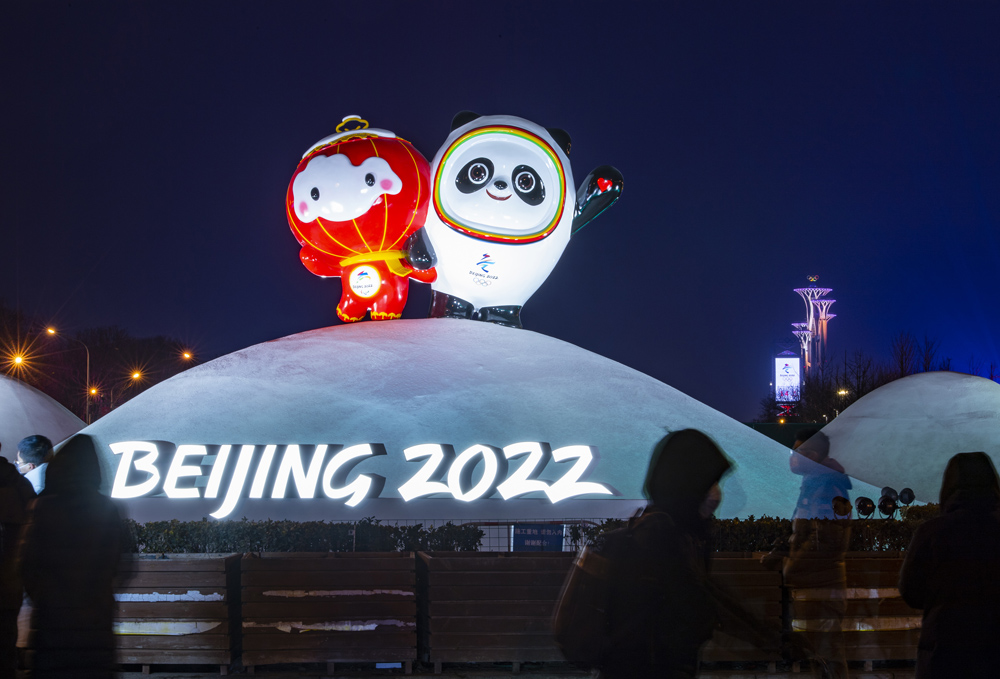 1月20日,位于北京市北土城路与民族大道交汇处题为“盛世华章”的北京2022年冬奥会和冬残奥会吉祥物“冰墩墩”“雪容融”造型亮灯。(图片来源:中新社)