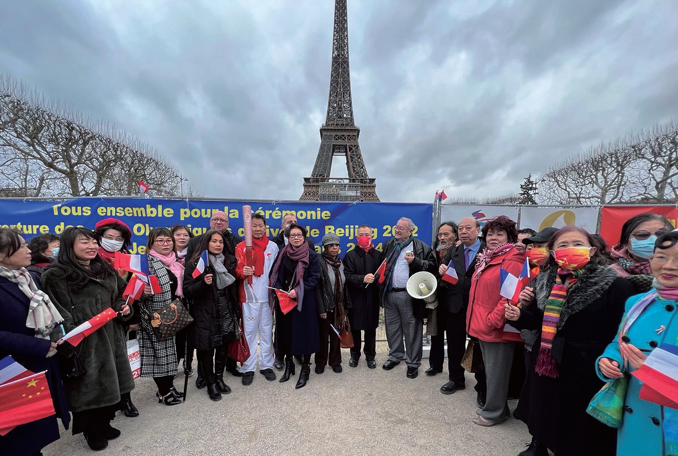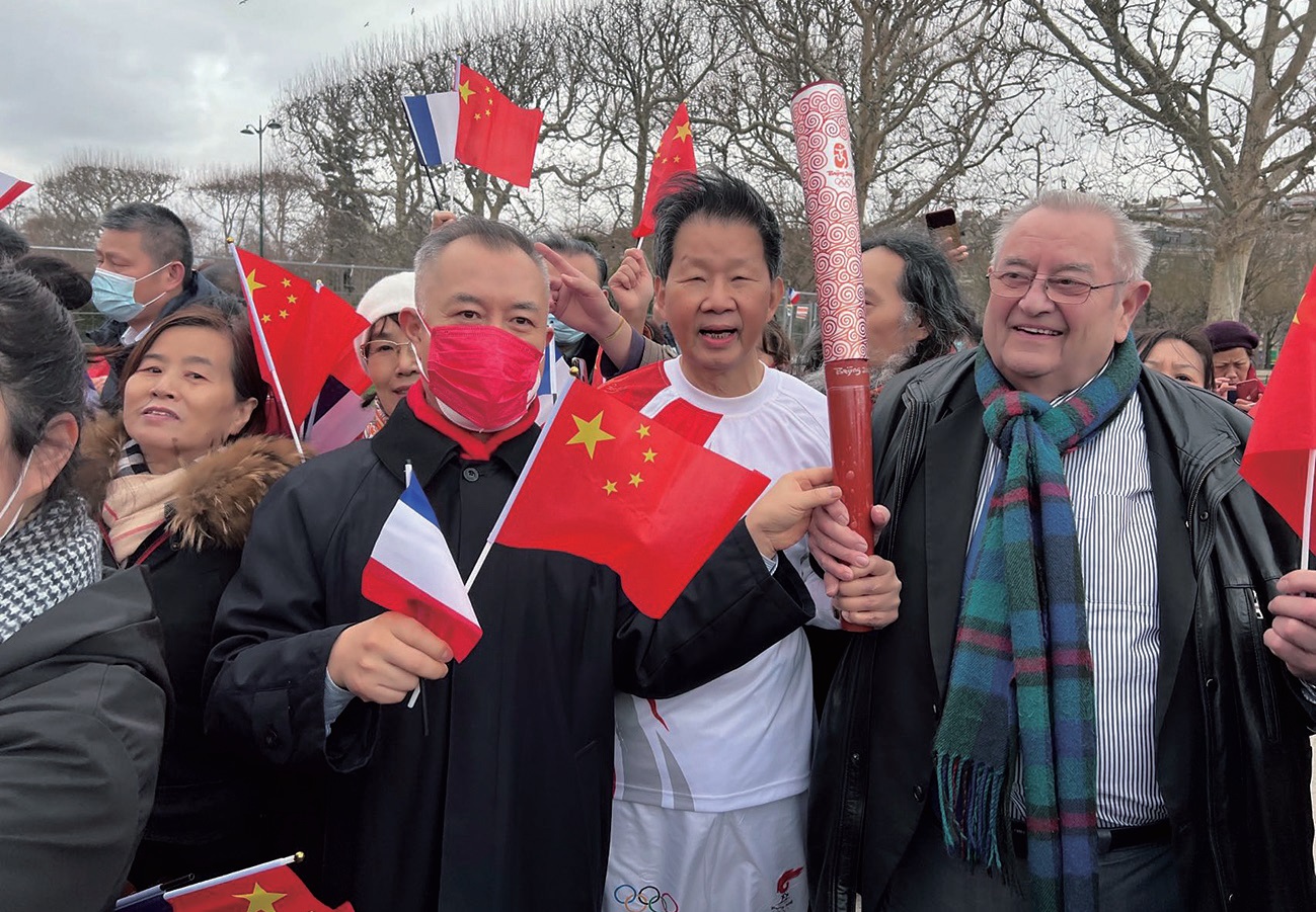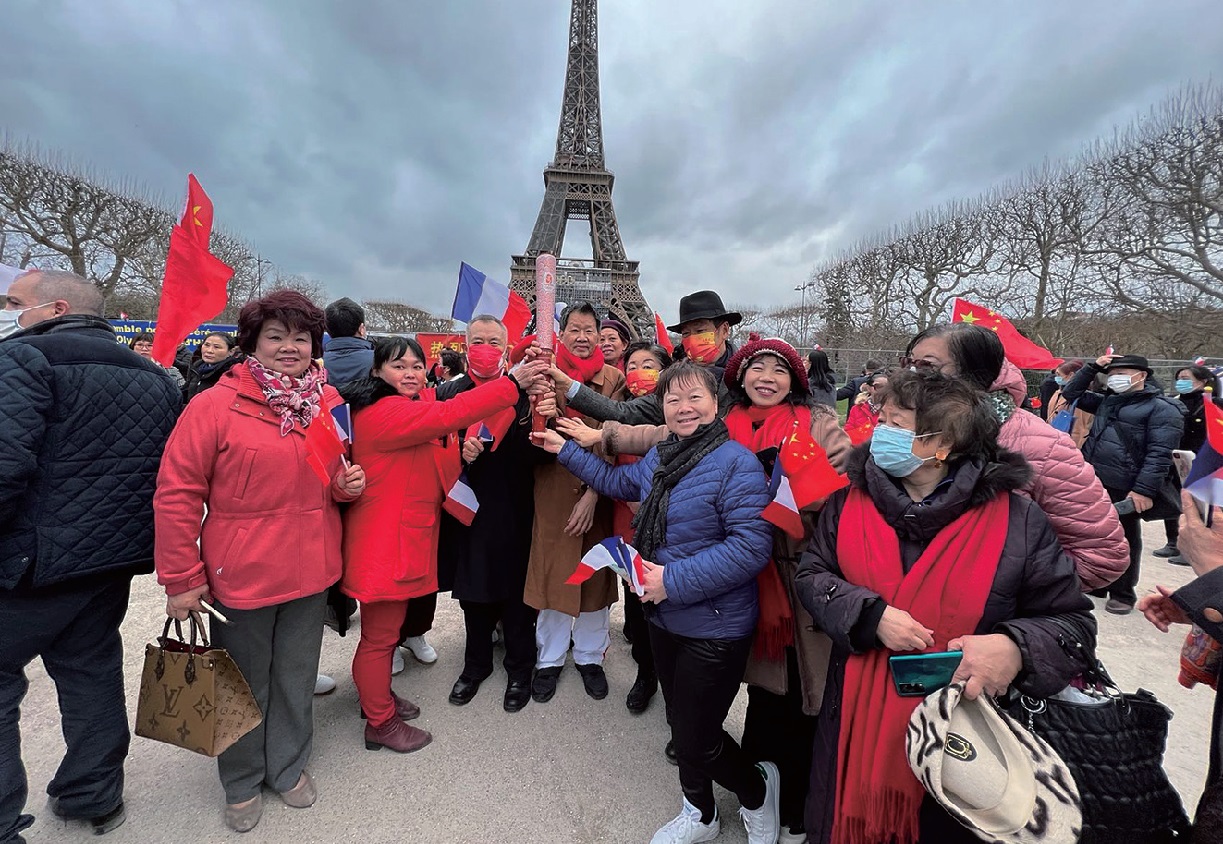 现场中法国旗飘飘,华侨华人高唱《北京欢迎你》等歌曲,大家用中法文呼喊“北京加油!”“巴黎加油!”等口号,现场气氛热烈。当天,他们还特别邀请了2008年北京奥运会巴黎奥运火炬手、法国潮州会馆名誉会长吴武华拿着当年的火炬,象征性的在现场进行了火炬传递,表示着北京承办奥运会从夏天走到冬天,成为世界上唯一“双奥之城”。