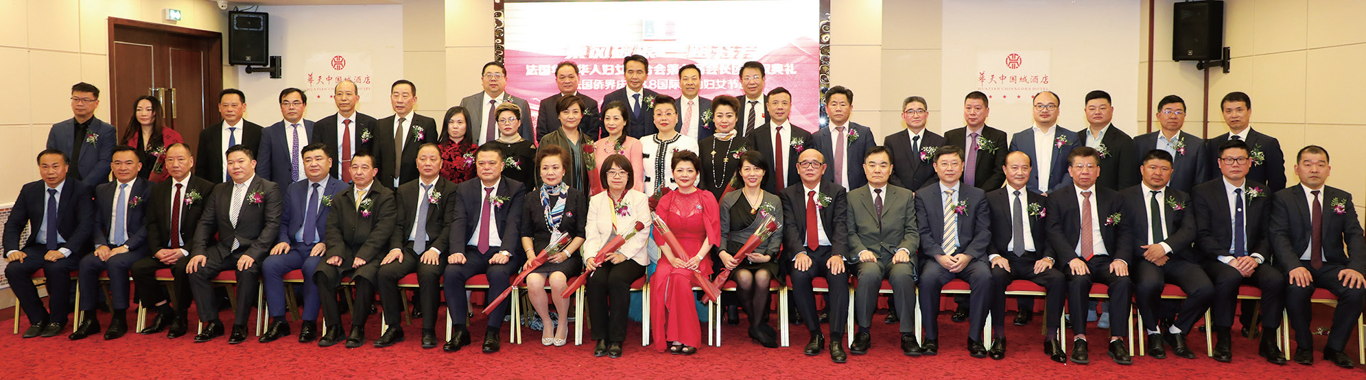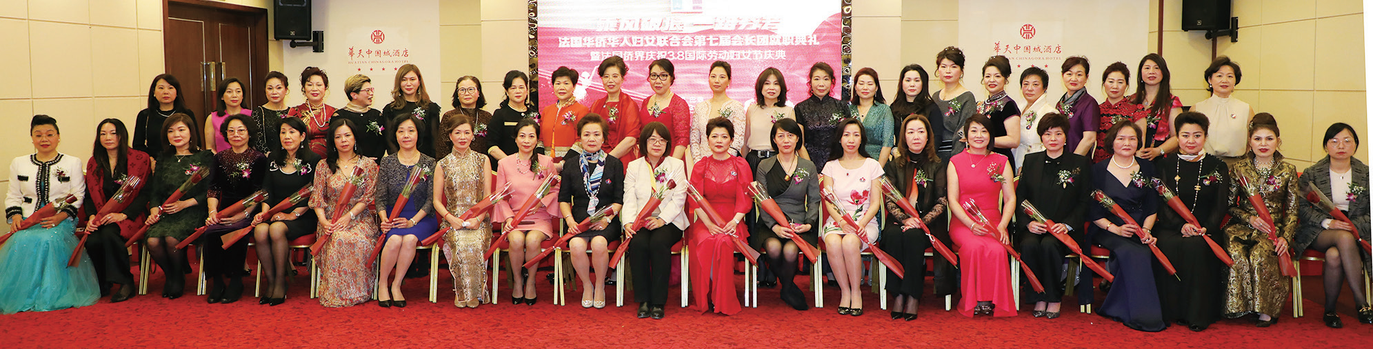 【欧洲时报记者黄冠杰巴黎报道】3月8日,正值国际劳动妇女节。巴黎华天中国城大酒店花团锦簇,欢声笑语,一派春意盎然的欢乐景象。旅法侨界的姐妹们身着节日盛装,共赴法国华侨华人妇女联合会(以下简称法华妇联)第七届会长团就职典礼暨旅法侨界庆祝“三·八”国际妇女节盛典。原法华妇联第六届会长团第一副会长陈岚从会长叶松兰手上接过会印,正式作为第七届会长带领新一届会长团就职履新。中国驻法大使卢沙野夫人王立文、领侨处公参高萍、一秘李成元以及旅法侨界代表、旅法侨界妇女代表出席盛典,见证接火传薪仪式,并共同庆祝“三·八”国际劳动妇女节。