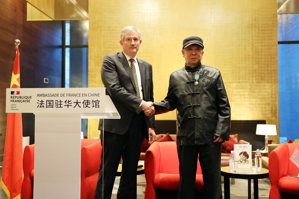 2022年3月9日,法国驻华大使罗梁(左)为中国漫画家李昆武颁授法兰西艺术与文学骑士勋章。 据介绍,李昆武1955年生于云南昆明,任云南省美术家协会理事、中国新闻漫画研究会常务理事。李昆武的作品至今已在中国、法国、英国、德国、西班牙、葡萄牙、荷兰、日本、韩国等国以16种文字正式出版,其作品曾荣获中国漫画最高奖“金龙奖”、法国圣马洛漫画节“最受读者欢迎奖”、法国布卢瓦“历史会晤国际漫画节金奖”等多项荣誉。 (图片来源:本文图片均由特约记者李大鹏 摄)