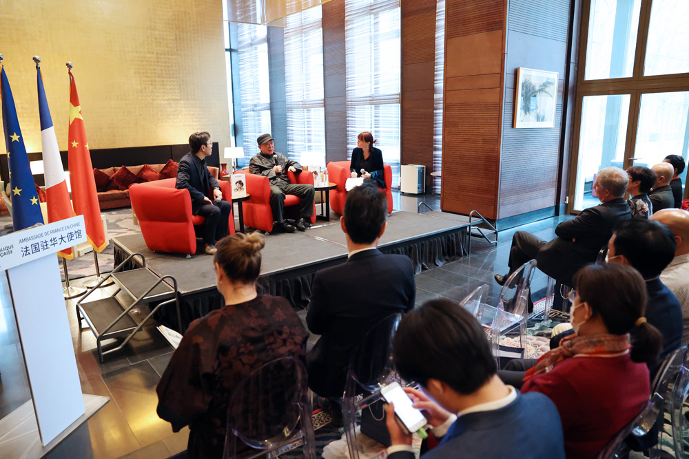 法国驻华大使罗梁(中)在活动现场阅读中国漫画家李昆武的书籍。