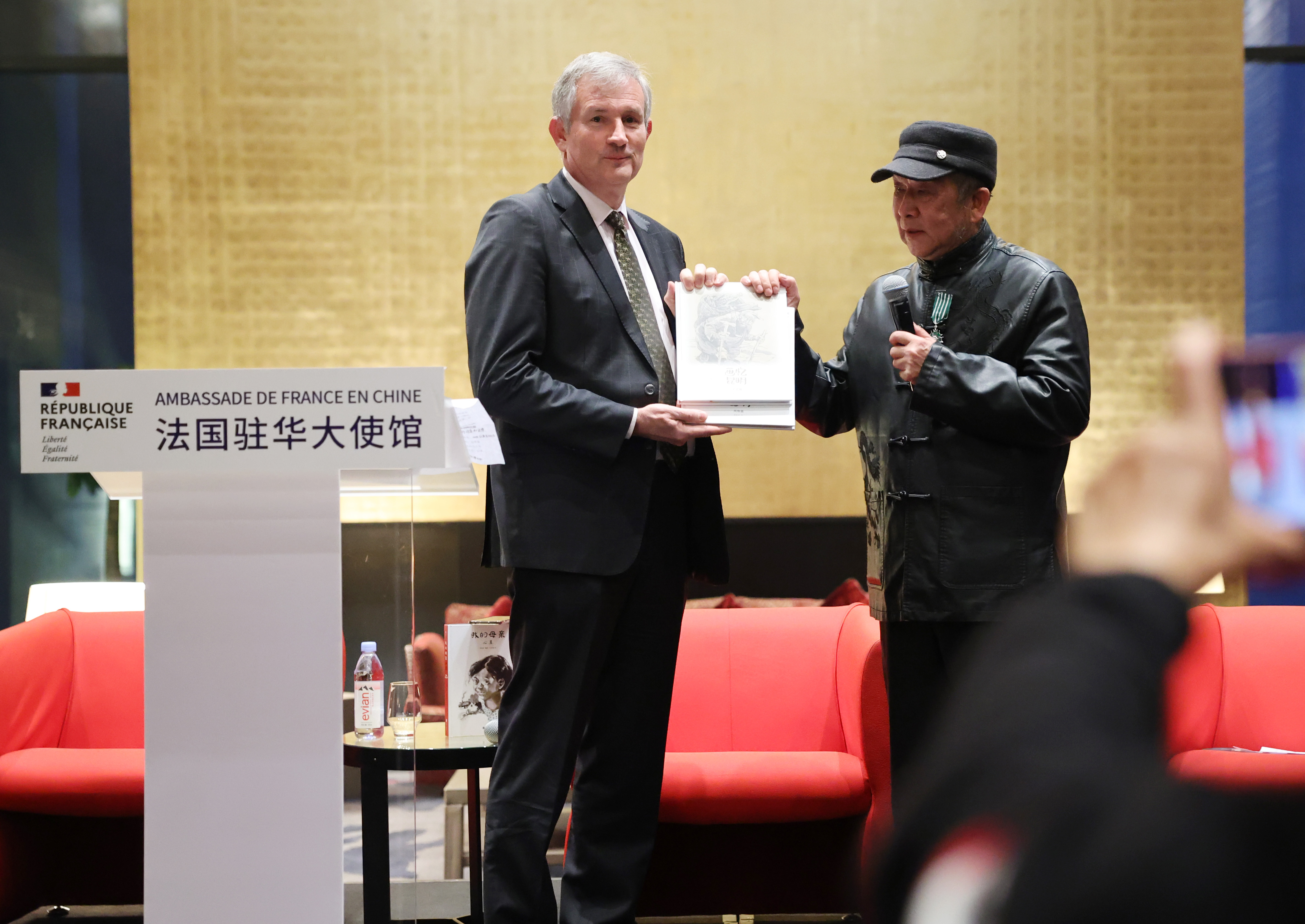 中国漫画家李昆武(右)向法国驻华大使罗梁赠送《画忆昆明》。