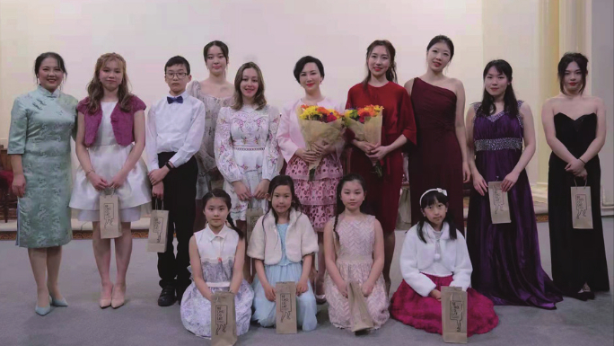 钢琴家李冰冰、歌唱家方鹂鹂(第二排右四、右五)和学生们在音乐会上合影。(图片来源:主办方供图)