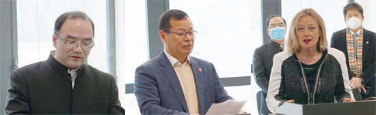 图为李江华副总领事(左)致辞,蒋玉林院长(中)致欢迎词,斯特拉斯堡高新开发区主任Martine MEYER女士致贺词。(图片来源:本文图片均自欧洲时报)