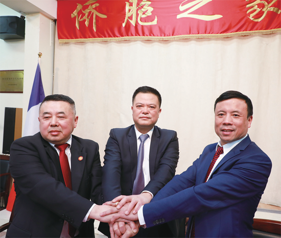 法国华侨华人会主席任俐敏(中)与第二十届当选主席蔡君柱(左)、第二十五届主席郑金标握手致意。(图片来源:本文图片由欧洲时报记者欧文 摄)