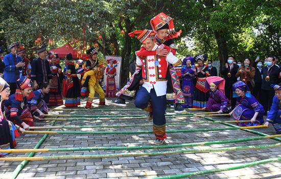 4月3日,广西归国华侨联合会联合英国广西联谊总会等侨团,在线上举办“广西三月三·乡音播全球”文艺汇演。在壮文化重要发源地南宁市武鸣区,一场地道的“壮族三月三”民俗文化展示活动精彩上演。图为壮族民众跳竹竿舞。(图片来源:中新社)
