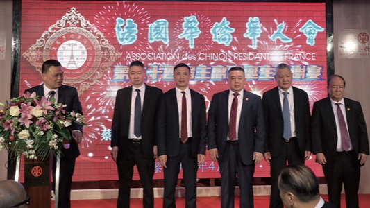 法国华侨华人会第22、23届主席任俐敏在致辞前,向在场嘉宾深鞠一躬,感谢各界对他五年来工作的支持和理解。