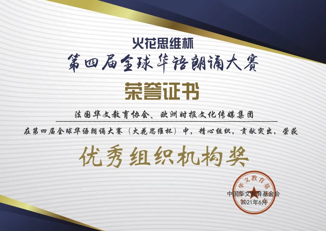 法国华文教育协会和欧洲时报文化传媒集团荣获了第四届全球华语朗诵大赛的优秀组织机构奖!