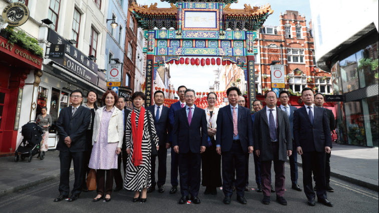 郑泽光在邓柱廷等侨领陪同下,走访了唐人街商铺并同旅英侨胞亲切交谈。