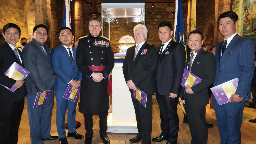 英国皇家庆典大臣布鲁诺、伦敦塔总督安德鲁和部分出席活动的华人嘉宾合影,右三为L Holding主席戴玮光,右一为蔡柏舟院士。