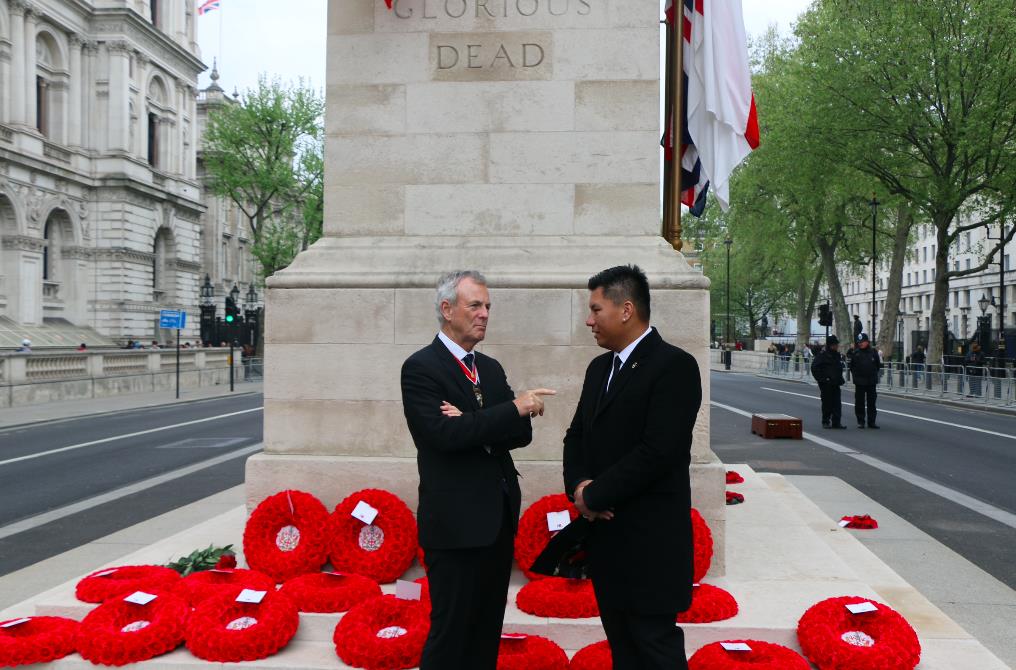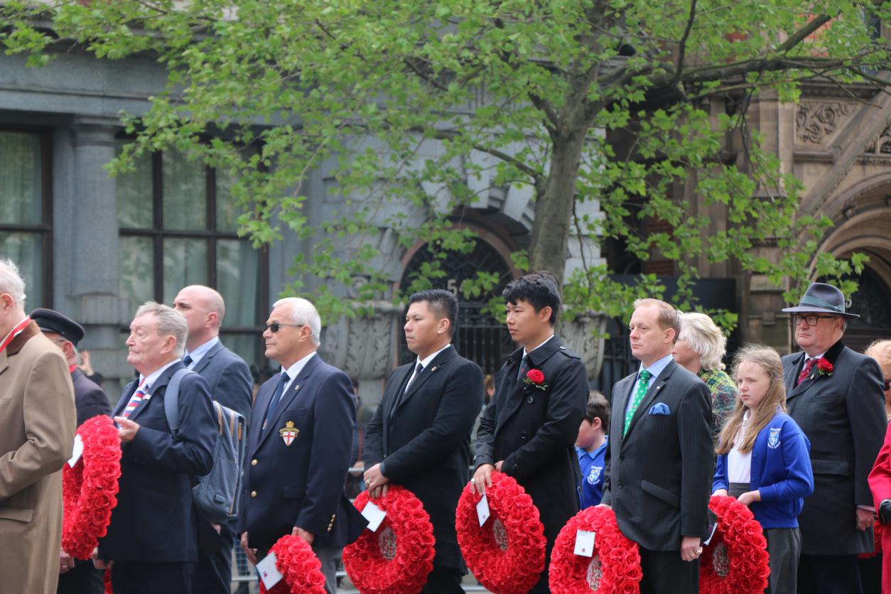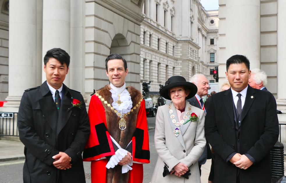 当天上午,伦敦白厅街上人山人海,伴随着军乐团的演奏,超过500名英国青少年与英国军队成员进行了军务表演。伦敦威斯敏斯特市长(Lord mayor of Westminster)安德鲁·史密斯(Andrew Smith)为华人代表蔡柏舟与戴玮光佩戴胸花,数千英国民众来到现场观看了仪式。