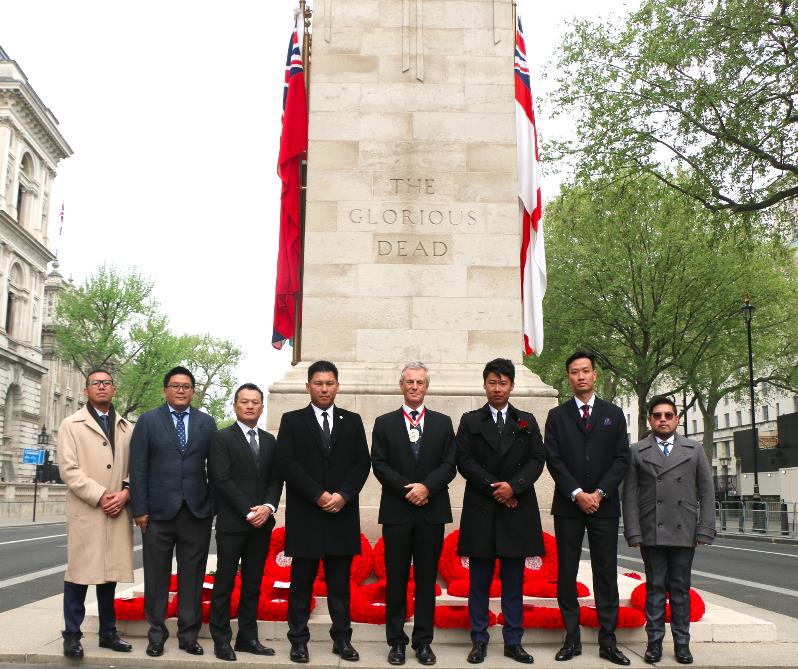 【欧洲时报记者王子璇图文报道】4月23日是“圣乔治日(St George‘s Day)”,也是英格兰的国庆日。当天上午在伦敦市中心的纪念仪式上,华人代表、英国皇家圣乔治学会会员、英国皇家艺术学会院士蔡柏舟与英国皇家圣乔治学会终身会员、L Holding Group主席戴玮光为和平纪念碑(The Cenotaph)献上花环。