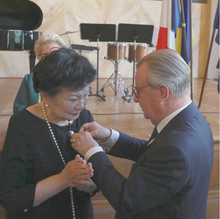 马耳他骑士军团法国主席蒂埃里·博蒙特·贝纳克向周勤龄授勋。孔帆摄