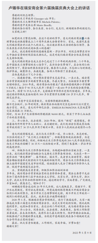 他接着表示,意大利瑞安商会创办至今,始终秉承创会宗旨,为侨胞解难,促侨社发展。疫情期间商会助力两国抗疫合作,帮扶困难侨胞,受到广泛好评。“你们在过去的20年里经历了旅意侨胞从艰辛创业到稳定发展的历史,参与了华人群体一步一步融入当地、得到接纳和尊重的过程。我衷心希望意大利瑞安商会在卢锡华会长的带领下,继续发扬优良传统,加强侨团功能建设,为提升华侨华人形象、推进中意友好合作不懈奋斗。也希望广大侨胞抓住中国意大利重启文化和旅游年的契机,借助‘一带一路’合作机遇,诚信创业,守法经营,实现自身价值,回馈当地社会,为两国民间友好交往发挥桥梁纽带作用。”