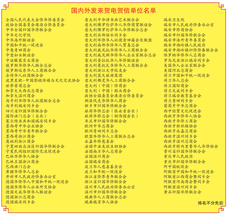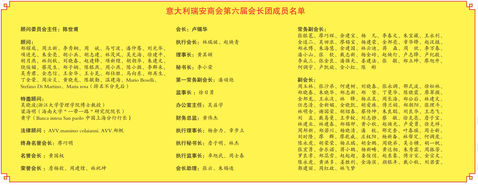 执行会长赵焕青接着宣读了全国人大发来的贺电,第一常务副会长潘颂炮宣读了全国政协发来的贺电,监事长徐日勇宣读了中国侨联发来的贺电,办公室主任吴益学宣读了中华海外联谊会发来的贺电,账务总监黄伟杰宣读了中华文化学院发来的贺电,执行秘书长林杰宣读了第六届意大利瑞安商会顾问、特邀嘉宾、核心成员名单。