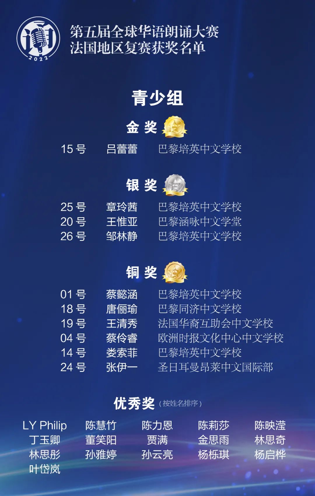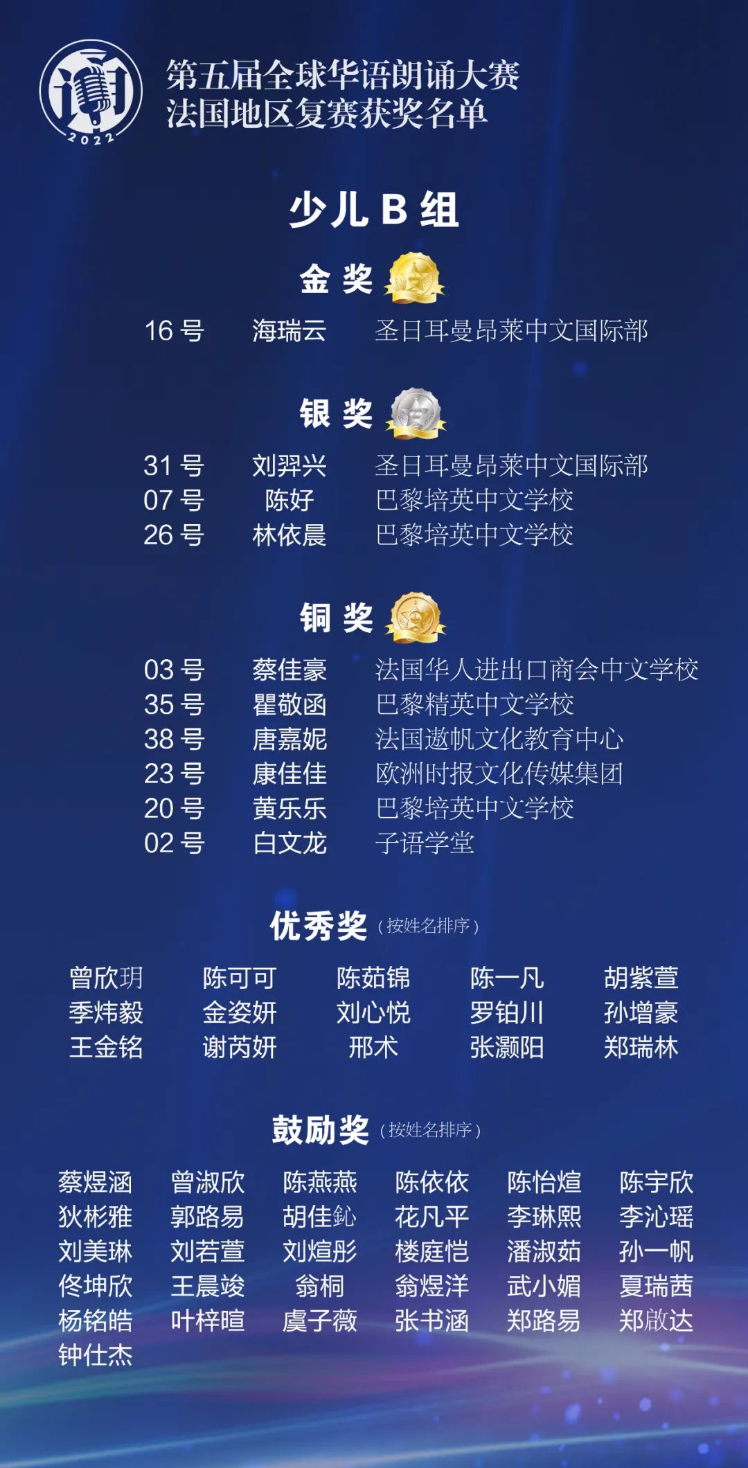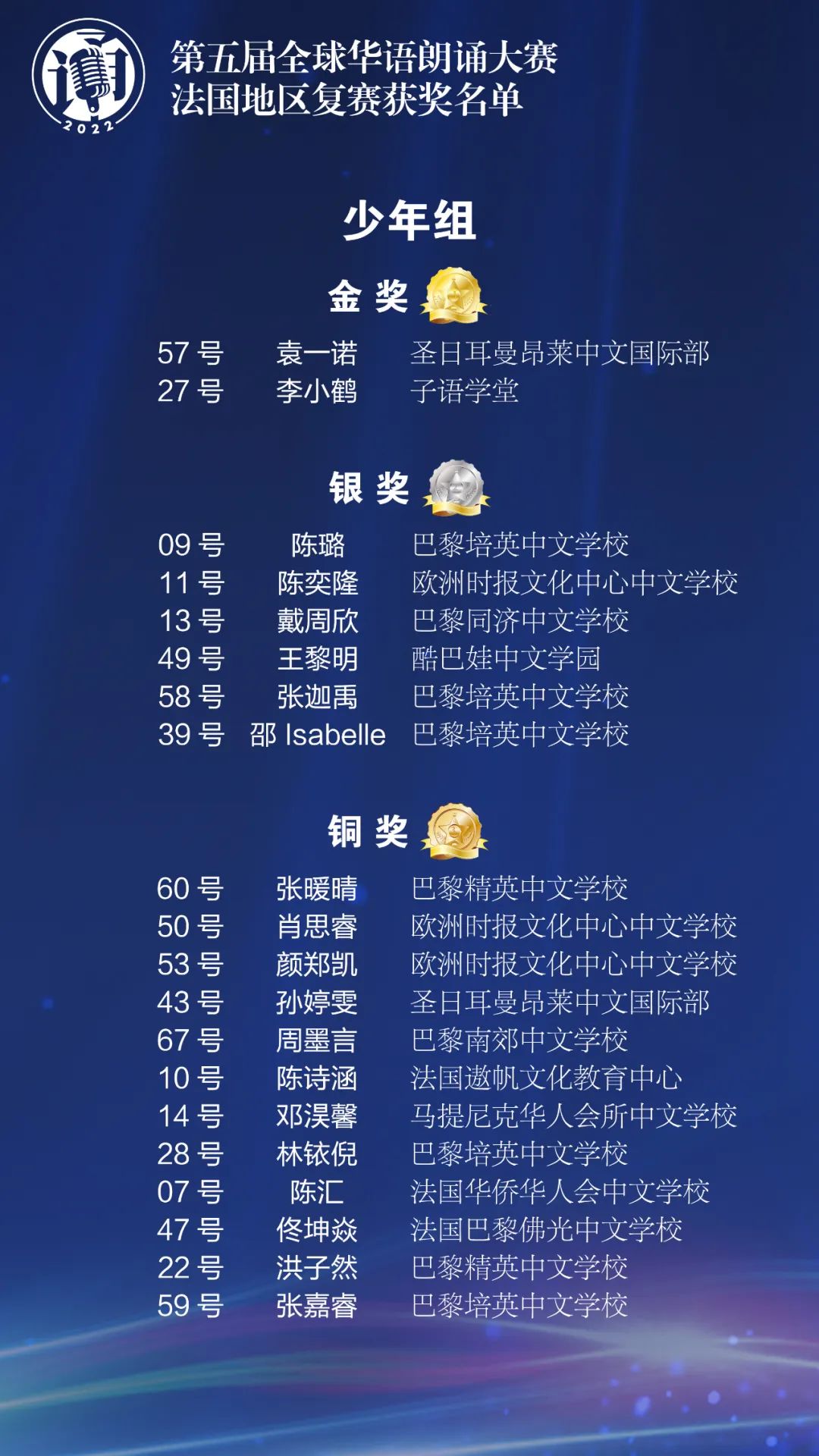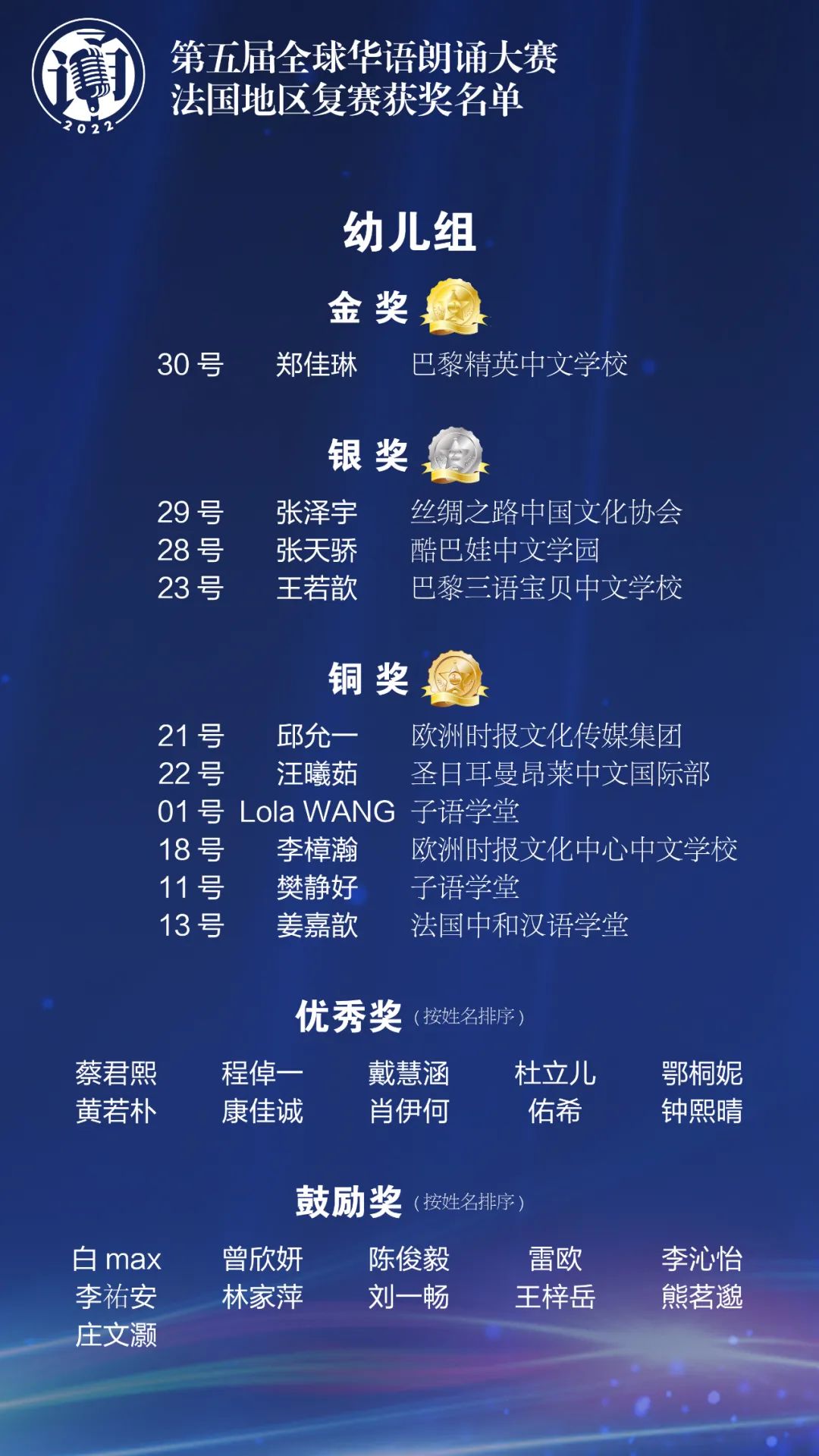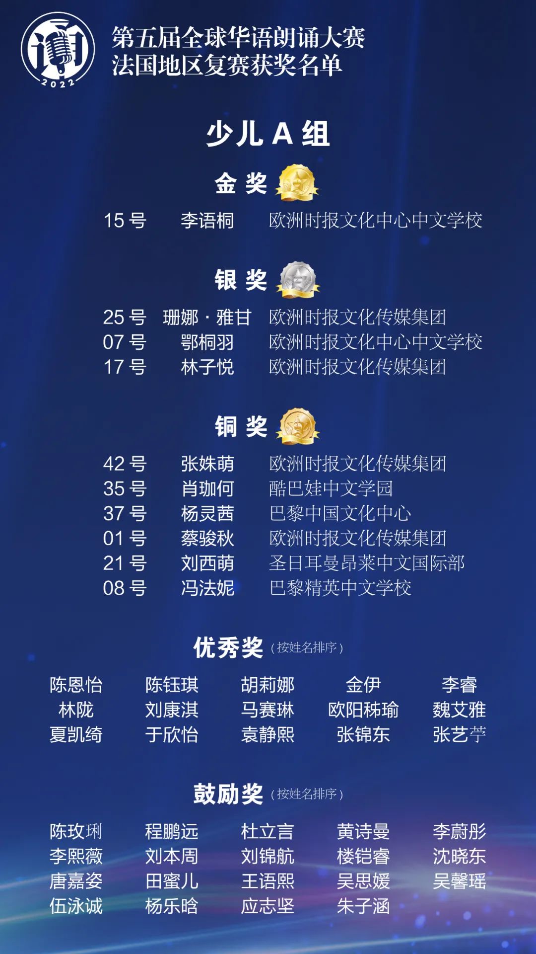 由中国华文教育基金会主办的第五届全球华语朗诵大赛于2022年4月隆重开启。在中国驻法国大使馆的大力支持下,法国华文教育协会和欧洲时报文化传媒集团联合近30家华校、华教组织共同协办了法国地区比赛,共有来自法国本土及海外省的1550名选手参加了初赛。