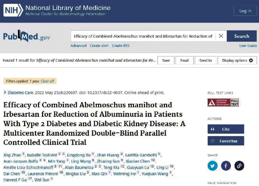 有关报道指出,2021年全球有糖尿病患者5.37亿例,2型糖尿病患者慢性肾病的患病率为34.5-42.3%,糖尿病肾脏疾病(DKD)是引起终末期肾病(ESRD)的主要原因,全球约有30%~50%的ESRD是由DKD所致,不仅危害居民健康,也严重影响社会经济的发展。蛋白尿是早期肾脏病持续损害的独立危险因素,控制蛋白尿对延缓肾脏病和糖尿病肾脏病的进展有重要意义。黄葵胶囊是江苏省中医院和苏中药业集团股份有限公司共同研发的中成药产品,在治疗各类慢性肾脏病蛋白尿方面均取得明显疗效。针对中医药对蛋白尿机理的认识,研究团队瞄准了DKD蛋白尿的治疗。江苏省中医院和法国巴黎公立医院集团比提耶-萨尔贝特耶尔医院是国家中医药管理局确定的中医药国际合作单位。自2011年4月开始,两个单位共同研究、设计并联合国内8家中、西医三甲临床医疗机构开展了黄葵胶囊治疗DKD蛋白尿的多中心、双盲双模拟、随机对照的临床试验。长达十余年的国际临床科研合作探索之旅证实黄葵胶囊与一线西药厄贝沙坦疗效相当,且更具优势,两者联合用药疗效更加显著。