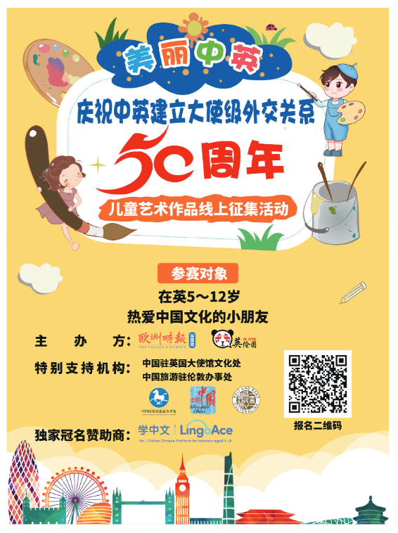 【欧洲时报】2022年是中英建立大使级外交关系50周年。50年同行,中英两国在文化、教育、经济、科技等诸多领域不断交流与融合,实现互利互惠、合作共赢。为了庆祝中英建立大使级外交关系50周年,欧洲时报英国分社将举办“美丽中英”儿童艺术作品线上征集评比活动。本次活动由欧洲时报英国分社、英伦圈主办,中国驻英国大使馆文化处及中国旅游驻伦敦办事处提供特别支持。