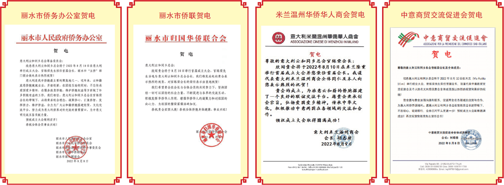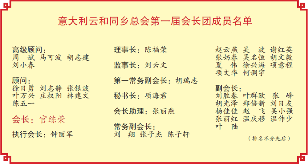 接着,理事长陈荣福宣读了意大利云和同乡总会第一届理事会成员名单;监事长刘云文宣读了丽水市人民政府侨务办公室、丽水市归国华侨联合会等海内外单位发来的贺电。
