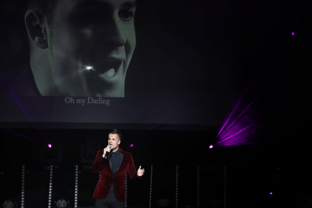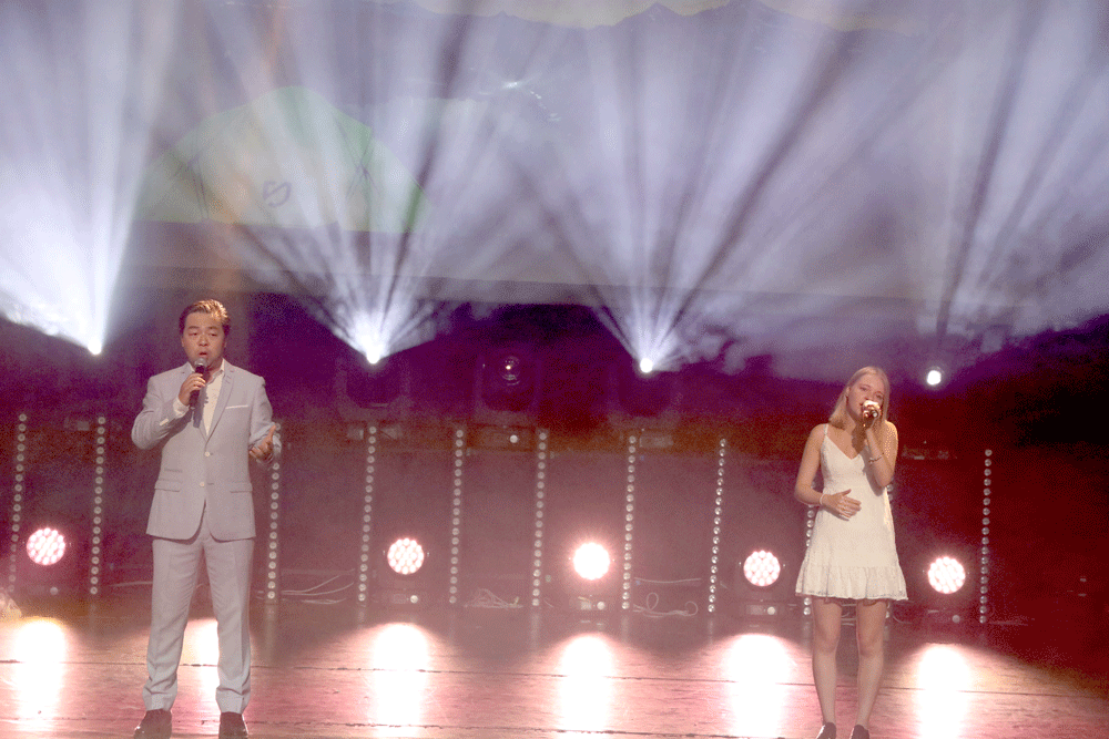 著名男高音歌唱家鲁智全(左)全携手外国友人组19岁的最佳潜力奖得主CandiceMETIVIER带来歌曲《苏州河》。