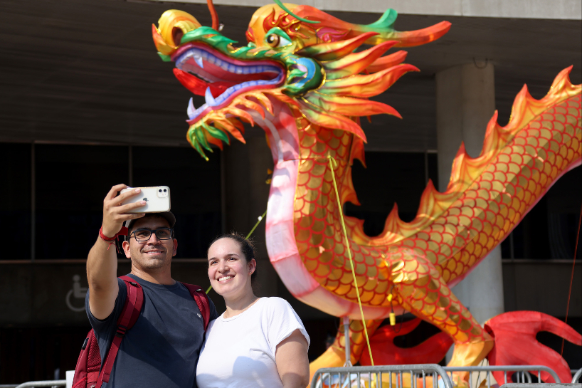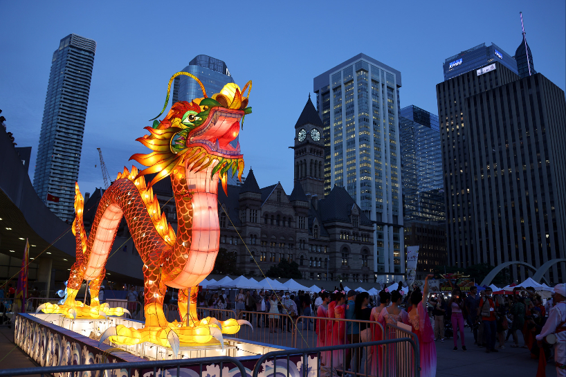 游人在第三届多伦多龙文化节活动现场被巨型龙灯所吸引。