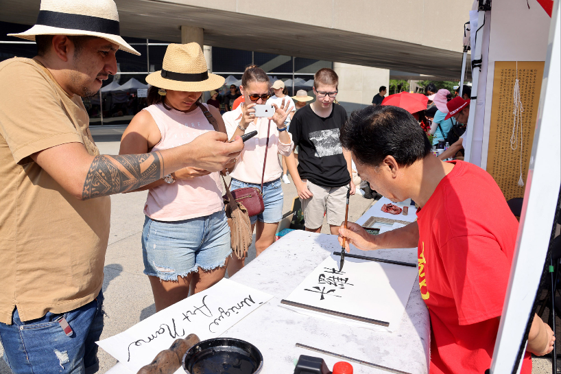 当地时间9月3日,在加拿大多伦多市第三届多伦多龙文化节活动现场,游人被中国书法展示所吸引。