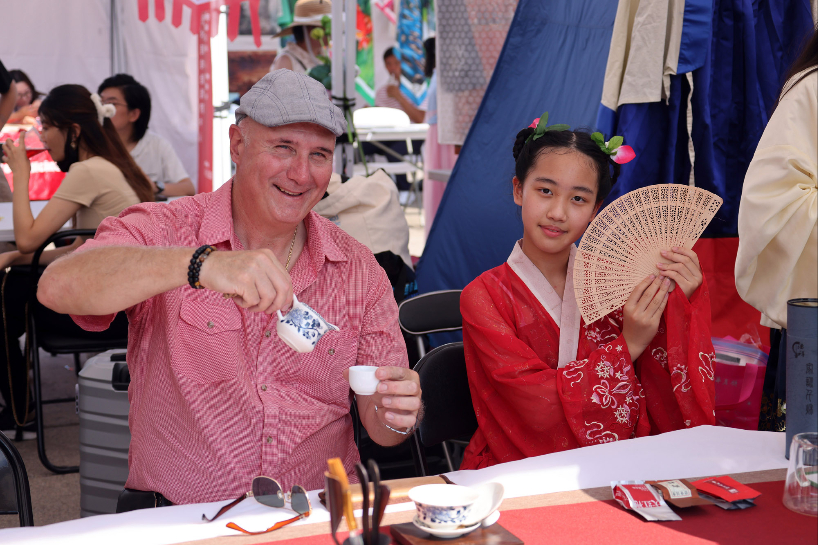 多伦多龙文化节持续三天,免费向公众开放,观众可体验和欣赏多样的中华文化展示。图为游人在第三届多伦多龙文化节活动现场品茗中国茶。
