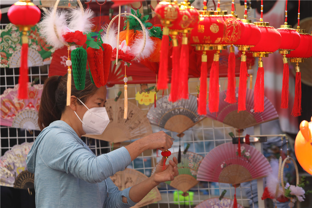 当地时间8月27日,在美国旧金山唐人街,一名女子在中秋街会上选购工艺品。(图片来源:新华社)