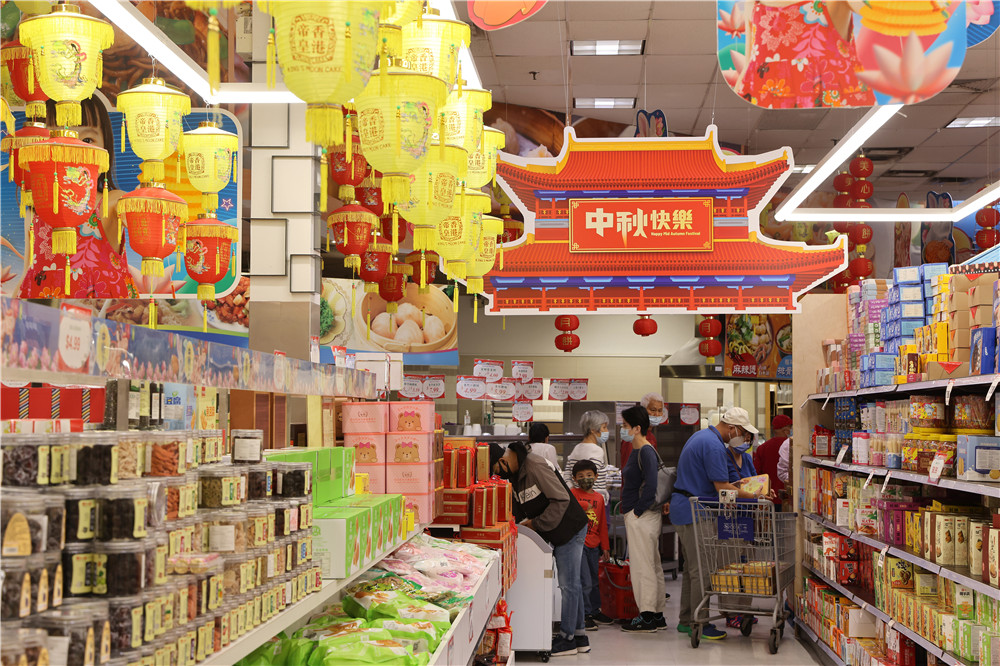 当地时间9月8日,中秋节临近之际,加拿大多伦多一间华人超市设立中秋商品专区,琳琅满目的月饼等商品吸引顾客驻足选购。(图片来源:中新社)