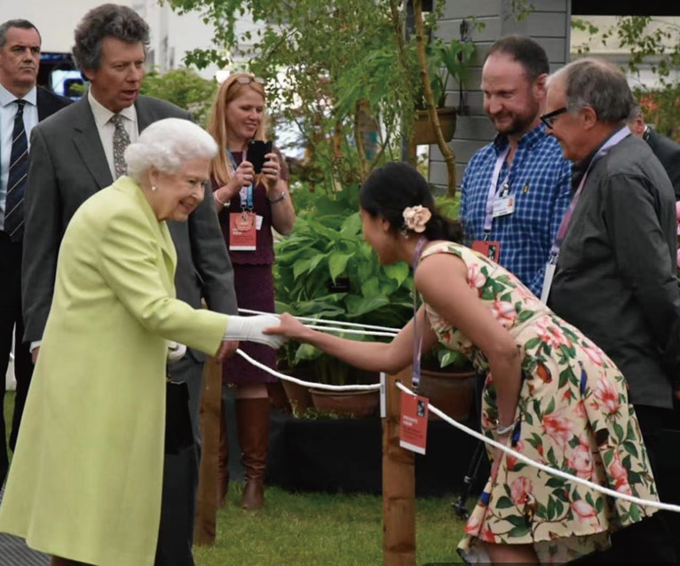 我第一次见到女王是在2019年的切尔西花展上。当时我受Binny Plants的邀请携我的工笔画牡丹图参展。晚上六点左右,我们正准备回去时突然听说女王来了,随后我在人群中发现了她——一头白发、个子娇小。切尔西花展的主席向女王介绍了我。我对女王鞠躬并和她握手,她笑得非常的灿烂,和她握手时放佛有一股暖流。