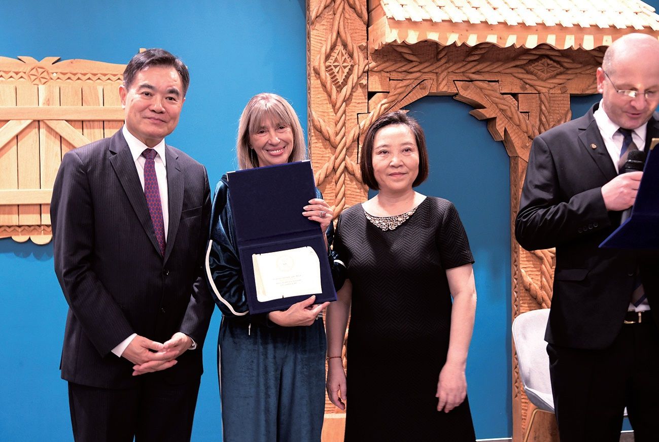 张晓贝和赵立共同为八位对罗马尼亚电影事业及中罗友好做出过杰出贡献的艺术家们颁奖。