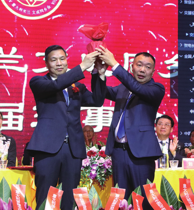 讲话结束后,胡小兵将会印和会旗转交至新会长胡海滨手中,标志着米兰文成同乡会顺利完成新老交接。