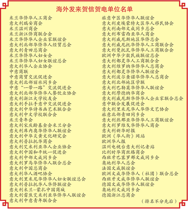 欧盟欧洲对外行动服务局主任Vincenzo Coppola上将、米兰副市长MichelaPlestra、米兰华侨华人工商会会长周立新、欧洲文成华侨华人社团联合总会主席刘小慧也分别发表讲话,他们对胡海滨表示祝贺,并希望第八届文成同乡会能一如既往地与意主流社会保持良好交流与沟通,继续为中意两国友好合作做出努力和贡献。