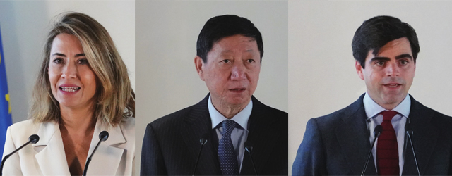 西班牙运输、出行与城市议程大臣拉克尔·桑切斯·希门尼斯(Raquel Sánchez Jiménez)、中国驻西班牙大使吴海涛、西班牙IE大学首席执行官迭戈·阿尔卡萨(Diegodel Alcázar Benjumea)讲话。(图片来源:本文图片均据欧洲时报实习记者李博洋 摄)