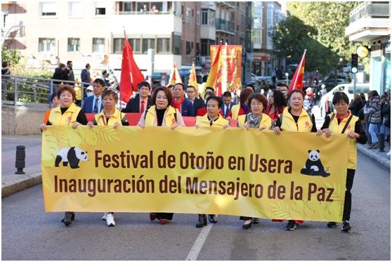 11月5日早间11时,彩妆游行队伍从Usera市政府出发,途径Dolores de Barranco大街,抵达著名中餐馆广东皇朝门口的广场,开始了熊猫雕像落成揭幕仪式。彩妆游行队伍中,舞龙舞狮、旗袍展扇子舞等喜庆的中国传统文化和热情洋溢的拉美游行队伍向结合,推动这一纪念日的气氛走向高潮。