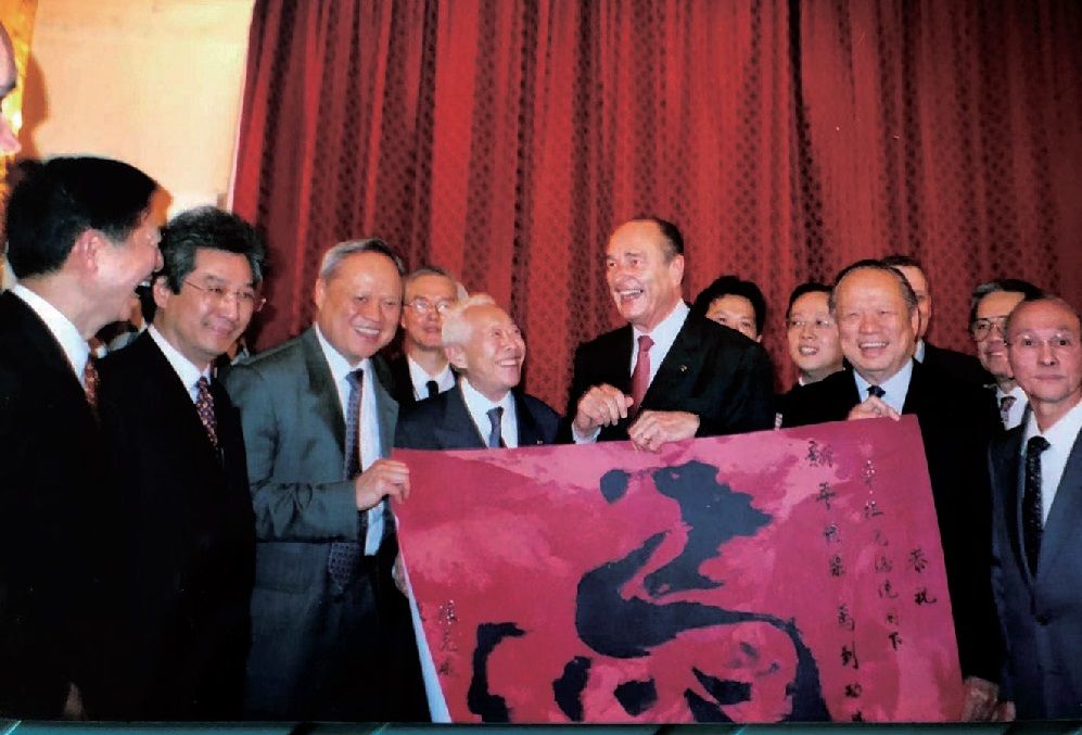 2002年,法国东南亚华裔侨团向时任总统希拉克赠送“马”字书法。前排自左至右:吴建民大使、薛伟涛先生、陈克光先生、画家赵无极先生、希拉克总统、陈克威先生。