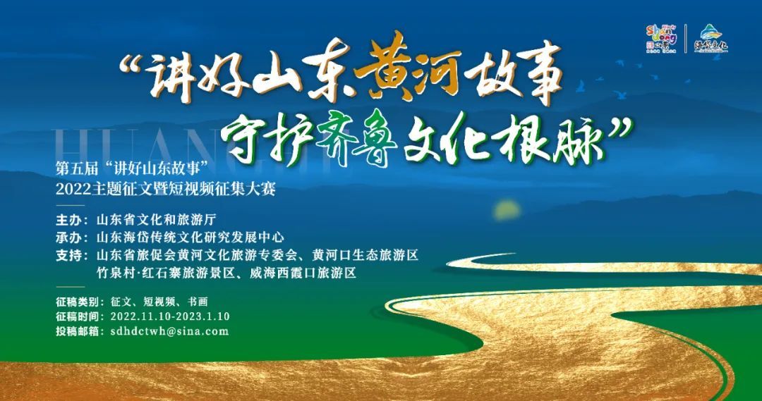 由山东省文化和旅游厅主办,山东海岱传统文化研究发展中心承办的“讲好山东黄河故事守护齐鲁文化根脉”主题征文暨短视频征集大赛于2022年11月10日正式启幕。大赛面向海内外作家、学者、书画家、短视频制作者、学生、艺术创作单位、社会团体以及所有黄河文化、齐鲁文化爱好者,征集以内涵丰富的黄河文化、优秀的齐鲁文化为主题的文学作品、短视频以及书画作品。大赛要求题材须取材于山东,围绕山东各地的文化符号,创作展现山东文化、黄河风采、齐鲁风韵的精品力作。