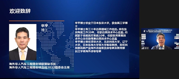 海外华人汽车工程师全球联盟秘书长,海外华人汽车工程师全球连线2022组委会主席,辛平博士欢迎致辞。